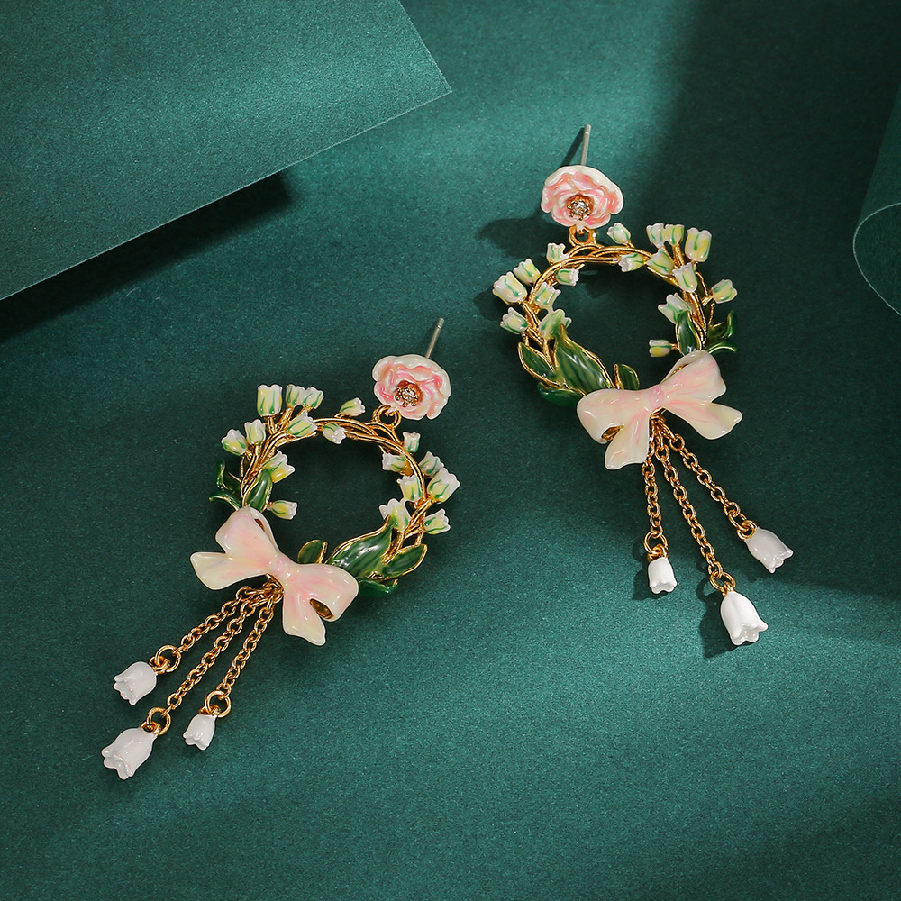 原创设计新款甜美时尚珐琅彩釉粉色玫瑰花朵蝴蝶结耳环女花环耳钉