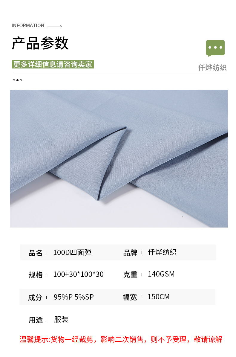 本网页所展示的有关【100D四面弹全涤平纹弹力面料 棉服运动服连衣裙衬衫时装里布布料_服装面料_苏州仟烨纺织有限公司】的信息/图片/参数等由服饰之家的会员【苏州仟烨纺织有限公司】提供,由服饰之家会员【苏州仟烨纺织有限公司】自行对信息/图片/参数等的真实性、准确性和合法性负责,本平台(本网站)仅提供展示服务,请谨慎交易,因交易而产生的法律关系及法律纠纷由您自行协商解决,本平台(本网站)对此不承担任何责任。您在本网页可以浏览【100D四面弹全涤平纹弹力面料 棉服运动服连衣裙衬衫时装里布布料_服装面料_苏州仟烨纺织有限公司】有关的信息/图片/价格等及提供【100D四面弹全涤平纹弹力面料 棉服运动服连衣裙衬衫时装里布布料_服装面料_苏州仟烨纺织有限公司】的商家公司简介、联系方式等信息。