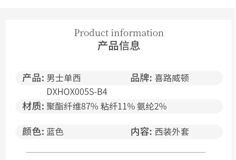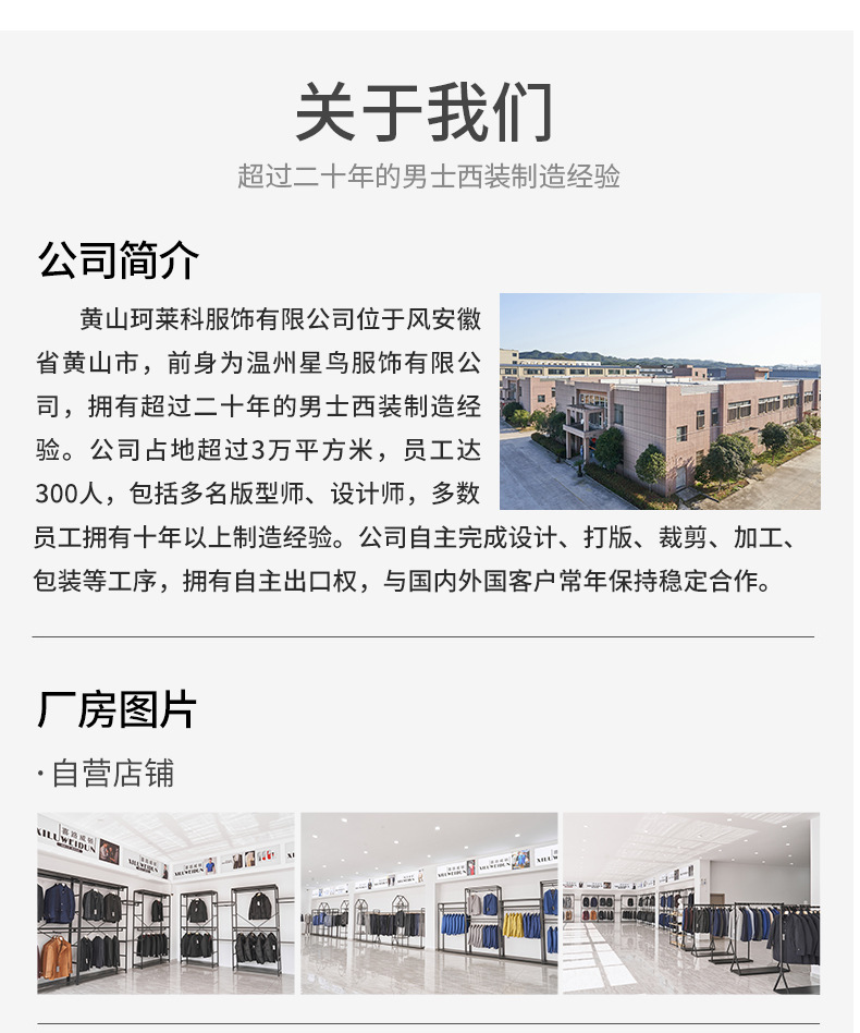 本网页所展示的有关【春季男装复古人字呢西装领两粒单排扣商务休闲单西时尚正装西服_西服西裤_黄山珂莱科服饰有限公司】的信息/图片/参数等由服饰之家的会员【黄山珂莱科服饰有限公司】提供,由服饰之家会员【黄山珂莱科服饰有限公司】自行对信息/图片/参数等的真实性、准确性和合法性负责,本平台(本网站)仅提供展示服务,请谨慎交易,因交易而产生的法律关系及法律纠纷由您自行协商解决,本平台(本网站)对此不承担任何责任。您在本网页可以浏览【春季男装复古人字呢西装领两粒单排扣商务休闲单西时尚正装西服_西服西裤_黄山珂莱科服饰有限公司】有关的信息/图片/价格等及提供【春季男装复古人字呢西装领两粒单排扣商务休闲单西时尚正装西服_西服西裤_黄山珂莱科服饰有限公司】的商家公司简介、联系方式等信息。